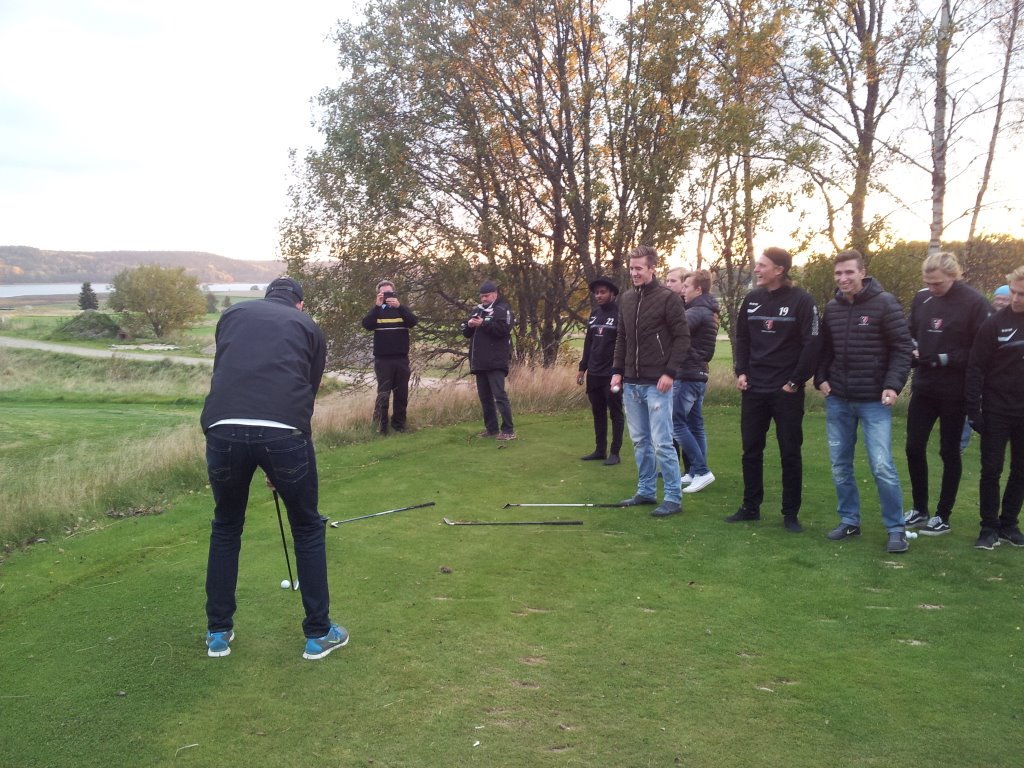 I strålande sol välkomnade värdparet Niklas & Matthildur Jansson oss med öppna armar framför klubbhuset. Kvällen inleddes med indelning i grupper där ena gruppen fick träna på att slå långt och finna ”bollkänslan” med liten boll Den andra gruppen övade puttning på en fantastisk fin green. Då fotbollsspelare har ”det” infann sig känslan ganska omgående Påpekas bör i ärlighetens namn att för några få behövdes lite mer tid….